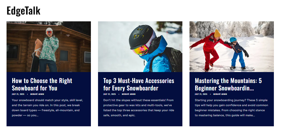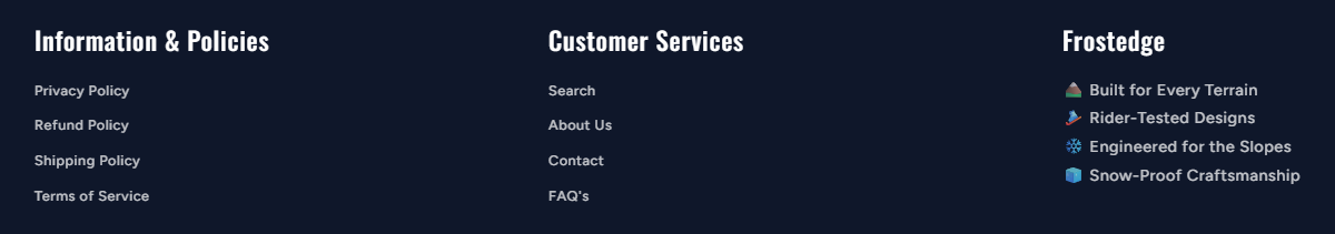 The FrostEdge Shopify Store Design is crafted for brands in the snowboarding, skiing, and outdoor gear niche. With a modern layout, smooth navigation, and cold-tone color palette, this design captures the essence of adventure while keeping performance and sales in focus.
